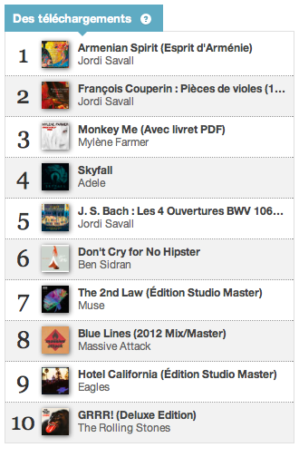 Cette semaine, Jordi Savall sublime le top des Téléchargements avec Armenian Spirit (1er) et Pièces de violes de François Couperin (2e). Le premier rend homage à Montserrat Figueras en même temps qu'à la musique d'Arménie, tandis que le second réunit Jordi Saval, Ton Koopman et Ariane Maurette pour un album Couperin fondateur du Label Alia Vox. Nous avons d'ailleurs rencontré il y a peu Jordi Savall pour un Podcast passionnant ("Enregistrer, cette drogue").